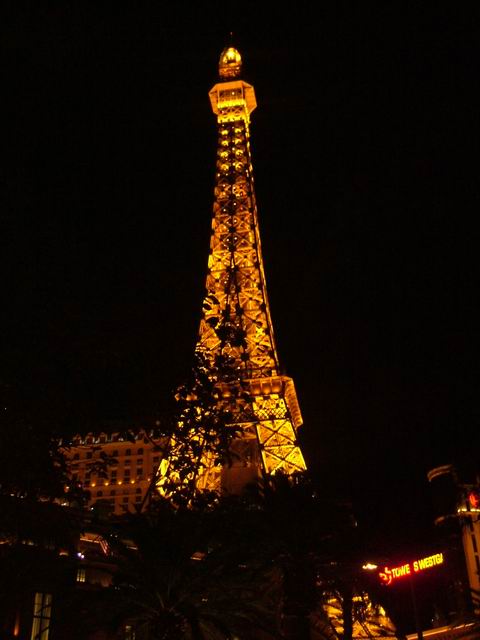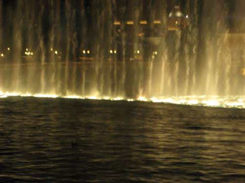 车子开到音乐喷泉前面,晚上再看跟白天看到的又不一样,灯光下的水柱很有梦幻感。音乐喷泉下车后听到的第一首曲子就是很喜欢的singing in the rain,突然很感动。从路边看喷泉,水面是黑黝黝的,还看到几只鸭子在悠闲地飘动,他们不会被喷泉冲上天么?喷泉对面是埃菲尔铁塔(伪),这可以登上去看风景的。慢慢逛回去,路过弗拉明戈去看了眼火烈鸟,晚上笼子那没有灯光,就看到个很模糊的轮廓,比较明显的是动物园的气味。因为爸爸一直跟在我身后,到离开赌场前都没机会在赌桌前坐下来试试玩玩,很遗憾呐。
